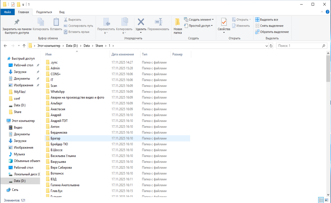 Для разграничения прав доступа к папкам, на диске D созданы отдельные директории D:\Data\Storage\Share\Наименование отдела.