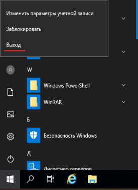 Для завершения работы нажимаем "Пуск", далее выбираем заначек пользователя и выбираем "Выход".